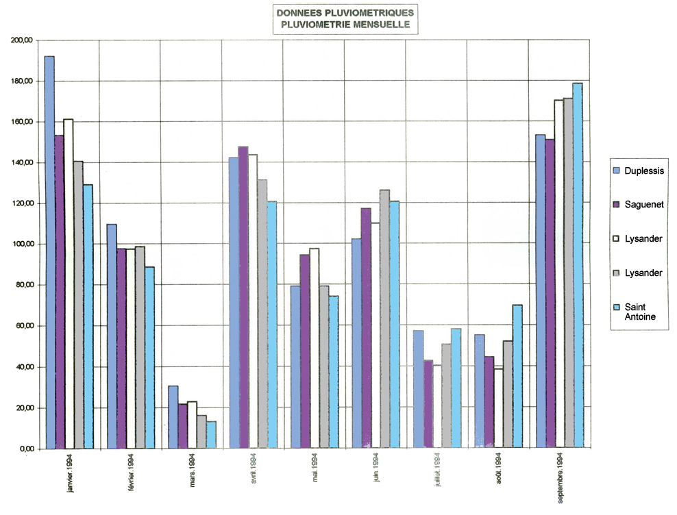 Voir les hauteurs pluviométriques enregistrées aux stations météorologiques les plus proches de la zone d’étude. On pourra noter qu’à la fin septembre 1994, plus de 900 mm de précipitations sont déjà tombés depuis le début de l’année, soit plus de la valeur annuelle moyenne.