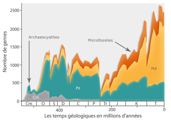 L'étude de la biodiversité et de ses variations au cours du temps est plus fiable en milieu marin, qu'en milieu continental car l'enregistrement sédimentaire - et fossiles associés - y est plus continu. Compte tenu des différences de préservation selon les gisements et les époques, la courbe de biodiversité au cours du temps a été réalisée à partir du décompte des organismes marins à squelette (coquilles, parties dures quel qu’elles soient), dont on peut supposer qu'ils/elles laissent des traces de manière plus continue dans les sédiments que les organismes à corps mous. Ainsi la courbe montre des variations de grande ampleur et des variations mineures :