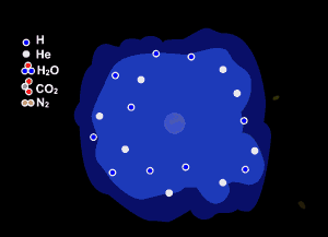 ». Ce terme désigne l’évacuation de volatils piégés dans les grains rocheux qui ont formé les noyaux planétaires. Le dégazage se manifeste de nos jours sous la forme d’éruptions volcaniques, qui injectent dans l’atmosphère des espèces comme l’azote, le méthane, le dioxyde de soufre, etc… Il a dû être particulièrement important au début de l’histoire des planètes telluriques, en raison de la quantité de chaleur engendrée par l’accrétion planétaire, et on peut imaginer que la Terre jeune était le siège de gigantesques éruptions volcaniques. D’autre part, les atmosphères secondaires peuvent avoir une origine externe. Des petits corps tels qu’astéroïdes et comètes ont percuté les planètes, surtout au début de leur histoire (comme en témoigne la cratérisation des surfaces planétaires et sa datation), et ont ainsi pu enrichir leurs atmosphères en éléments volatils. Les comètes, en particulier, sont riches en glaces de toutes sortes (H2O, CO2, CO, N2, CH4, et en une quantité de molécules organiques), et ont très probablement contribué à la formation de l’atmosphère de la Terre. Il a même été envisagé que les océans terrestres puissent provenir de l’eau contenue dans les comètes, mais cette explication ne peut être que partielle, car le rapport d’abondance entre le deutérium et l’hydrogène (D/H) dans les comètes est 2 fois plus élevé qu’il ne l’est dans les océans. Le rôle des comètes en tant que source de molécules pour les atmosphères planétaires a néanmoins été démontré de manière spectaculaire en 1994, lorsque la comète Shoemaker-Levy 9 a percuté Jupiter et déposé un certain nombres d’espèces chimiques (HCN, CS par exemple) qui n’y étaient pas présents auparavant. Le vent solaire est également une source mineure d’atmosphère, implantant en particulier des gaz rares dans les surfaces des planètes telluriques, espèces que l’on retrouve dans leurs atmosphères.