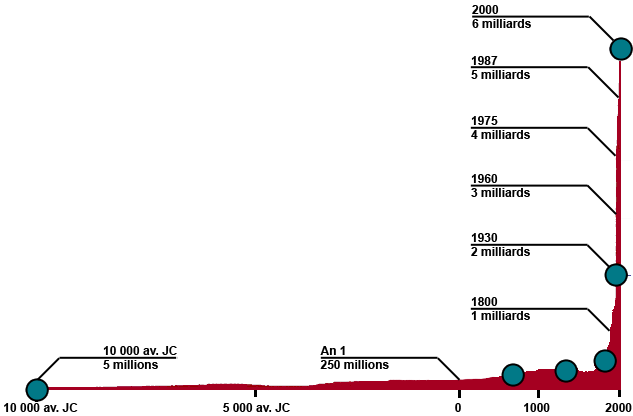 La première chose que je voudrais souligner est la rapidité avec laquelle ce problème d’effet de serre s’est proposé à nous. Vous voyez sur cette échelle que l’humanité est restée au dessous du milliard d’habitants pendant très longtemps, jusqu’au XIXe siècle et que depuis, et notamment grâce à l’utilisation importante des combustibles fossiles qui ont remplacé la peine humaine par de l’énergie apparemment abondante et peu chère, nous sommes montés très, très vite à plus de 6 milliards d’habitants.