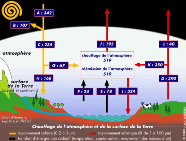 Ainsi, en plus des échanges radiatifs décrits plus haut, l’énergie est échangée entre la surface et l’atmosphère sous forme de chaleur sensible et latente, et cette énergie est transportée par la convection. La figure 5 donne les ordres de grandeur des différents termes. Á gauche, on décrit le devenir du flux solaire (A) : Réfléchi vers l’espace (B), absorbé dans l’atmosphère (G) absorbé par les surfaces (H). Á droite, on trouve le devenir du flux tellurique provenant de la surface (D) ; absorbé dans l’atmosphère (K) ou transmis jusqu’à l’espace (L). Au centre, on trouve les autres échanges : Chaleur sensible (F), chaleur latente (E), flux tellurique émis par l’atmosphère en direction de la surface (I) et de l’espace (J). Notons que le bilan net à la surface en infrarouge (390-324=66