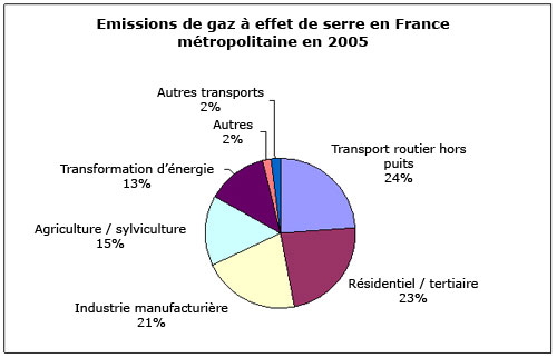 dans l’atmosphère permettent de réaliser le bilan d’utilisation d’énergies fossiles de la population. Ainsi, la répartition des émissions d’un ménage français correspondent à 50 % pour l’utilisation de la voiture, 30 % dû au chauffage et 15 % aux équipements électroménagers et de réfrigération. Cette pollution directe est accompagnée d’autres activités productrices de gaz à effet de serre qui dépendent de nos choix de consommation. Par exemple, la chaîne de production de fruits et légumes est liée à une forte émission de gaz à effet de serre : cultures à engrais, utilisation de machines agricoles, transport, transformation et conditionnement, jusqu’à la distribution.