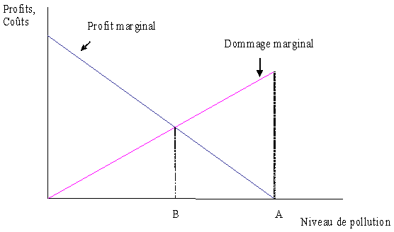 Si le coût social de production (la somme du coût privé et du coût externe, ici les pertes subies par le pêcheur) est pris en compte, le niveau optimal de pollution se situe au point B. En effet, du point de vue de l’économie dans son ensemble, le surplus marginal dégagé par l’entreprise horticole en ce point est exactement égal au coût de la pollution pour le pêcheur. Si le niveau de production (et de pollution associée) se situe avant le point B, l’unité marginale de production rapportera davantage à l’entreprise qu’elle ne coûte au pêcheur : le dommage subi par ce dernier ne justifie pas de renoncer au surplus issu de la production, et le surplus total au niveau de l’économie peut être accru par une augmentation du volume de production (et de pollution). Si le niveau de production se situe après le point B, la pollution induite par l’unité marginale de produit coûte plus au pêcheur que sa production ne rapporte à l’entreprise : le surplus total au niveau de l’économie peut être amélioré par une réduction du volume de production et de pollution.