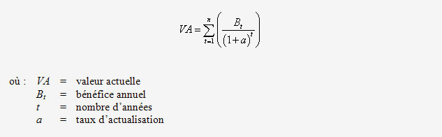 Supposons un bien environnemental qui génère un bénéfice annuel constant, sa valeur actualisée avec un horizon fini est donnée par la formule suivante :